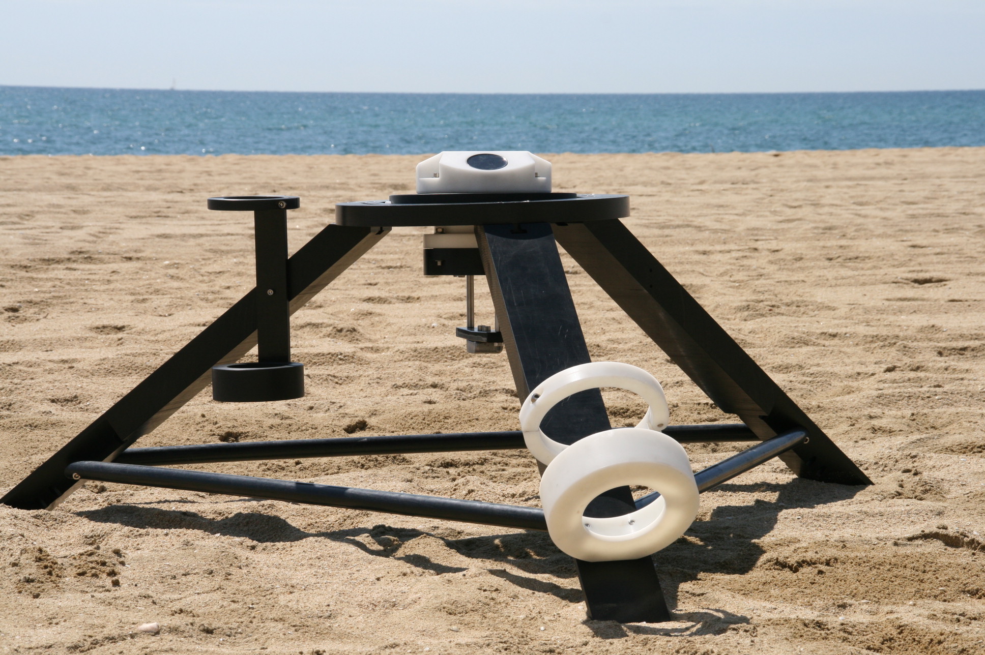 Support designed for the deployment of Nortek current profilers. The tripod can be fitted with various accessories such as a battery cylinder, mounts for additional sensors, Teledyne Benthos acoustic modems, etc. It is designed to carry additional ballast if required, as well as to be fixed to the seabed. The tripod can be deployed in an anti-toppling configuration to withstand strong current forces. It can be equipped with a gimbal to ensure vertical alignment even on uneven seabeds. It is manufactured from corrosion-resistant materials: plastics (POM, P500 and PVC) and metallic components made of AISI 316L or A4 stainless steel (gimbal shafts and fasteners).